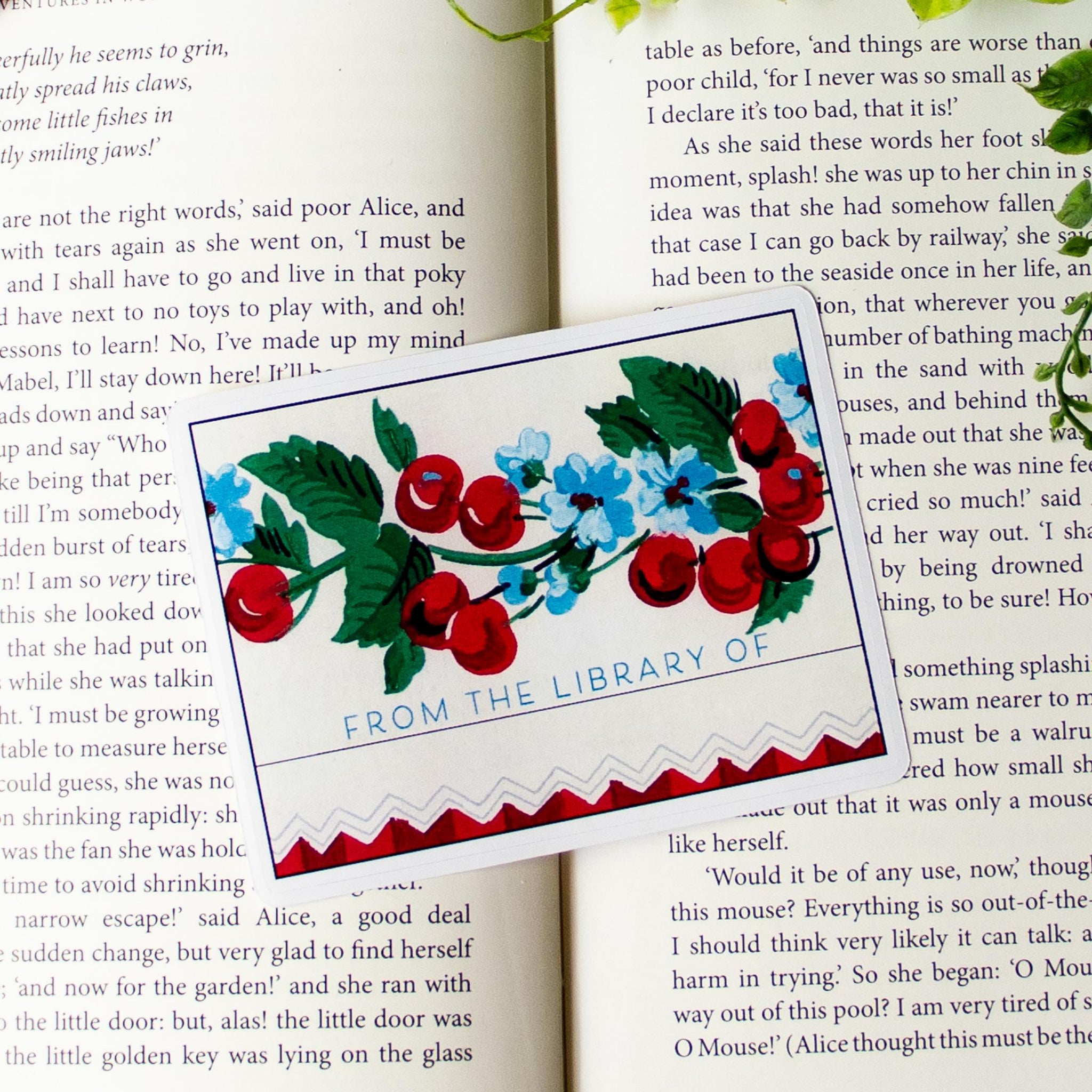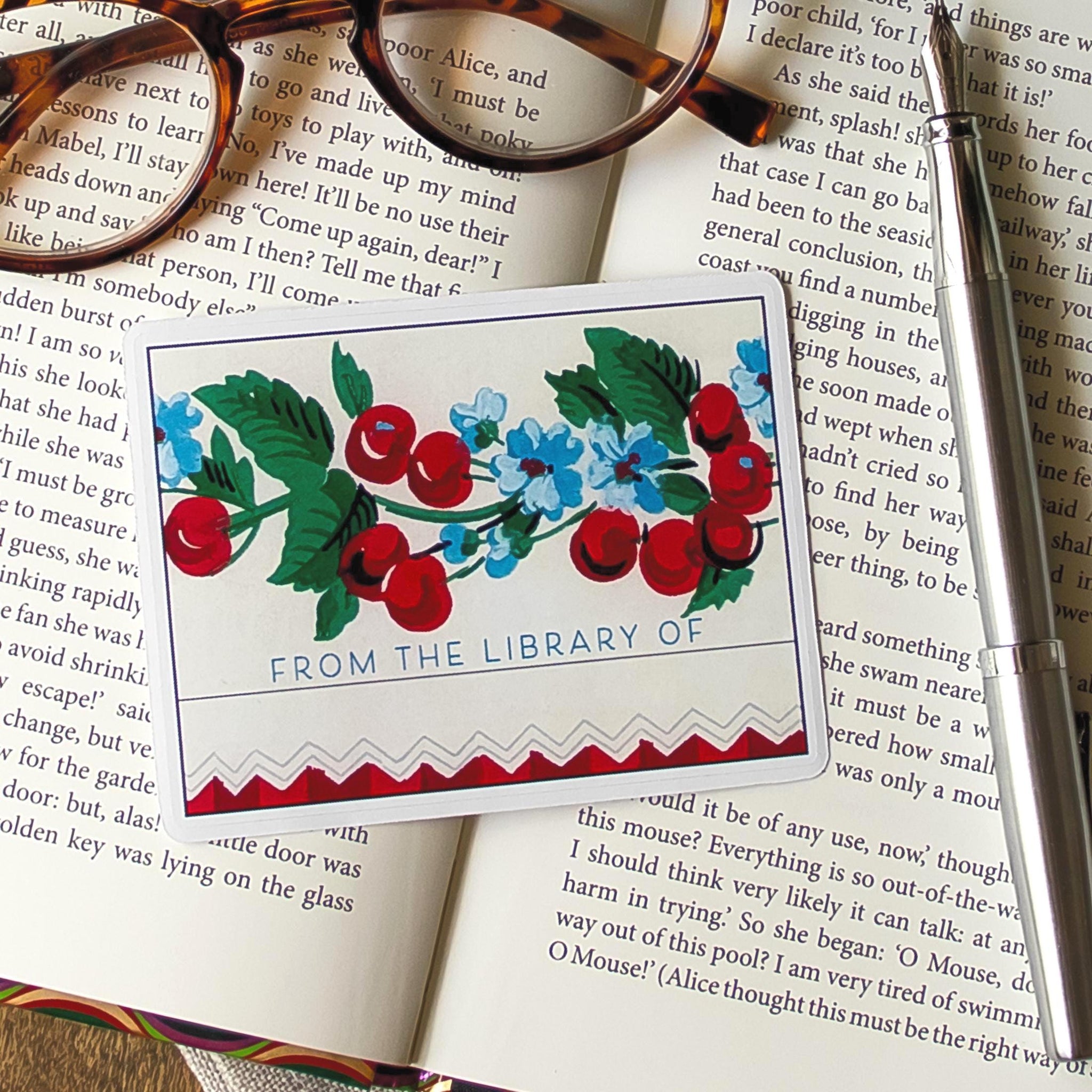 This self-adhesive peel-and-stick bookplate sticker features a cheerful vintage-inspired cherry and floral motif with a zigzag trim detail and the phrase "From the Library Of" — ready for your name or signature.