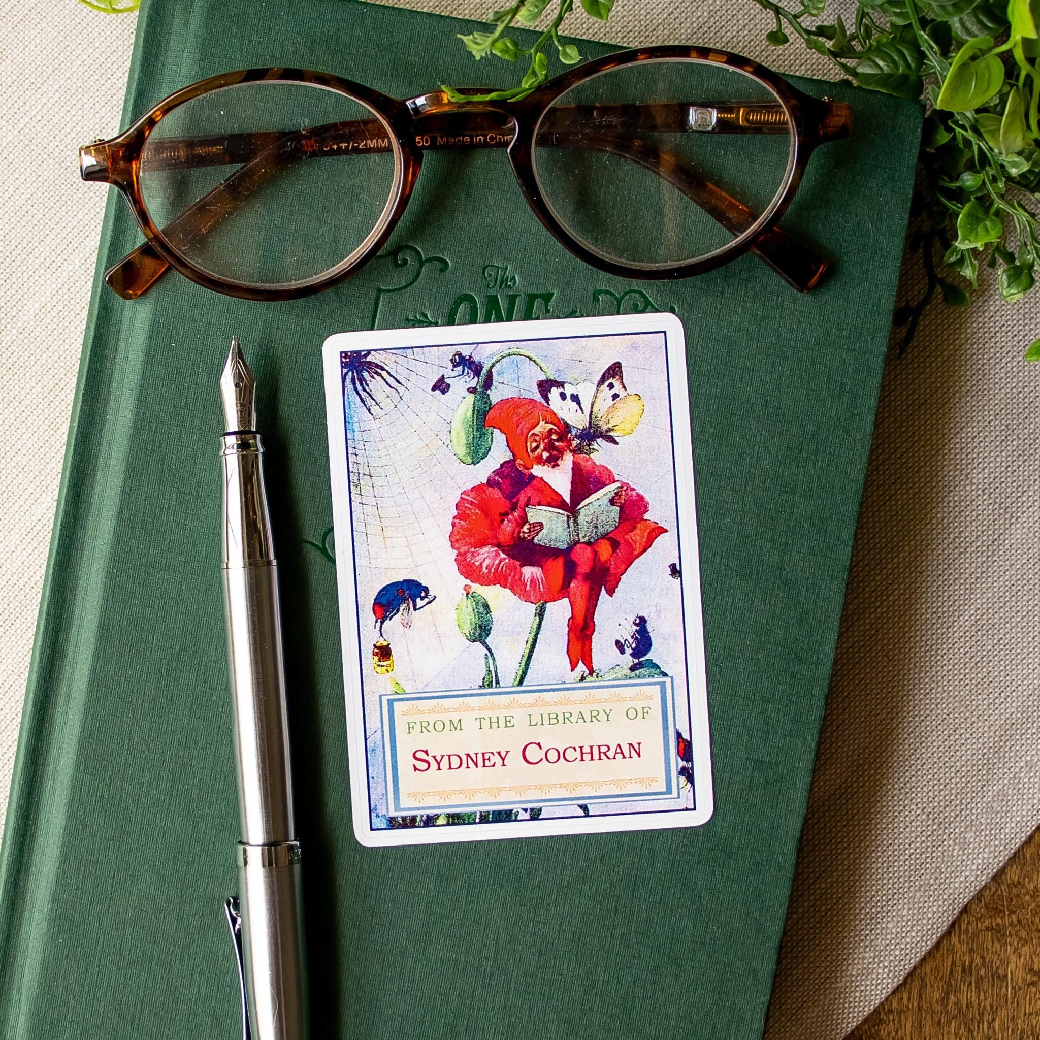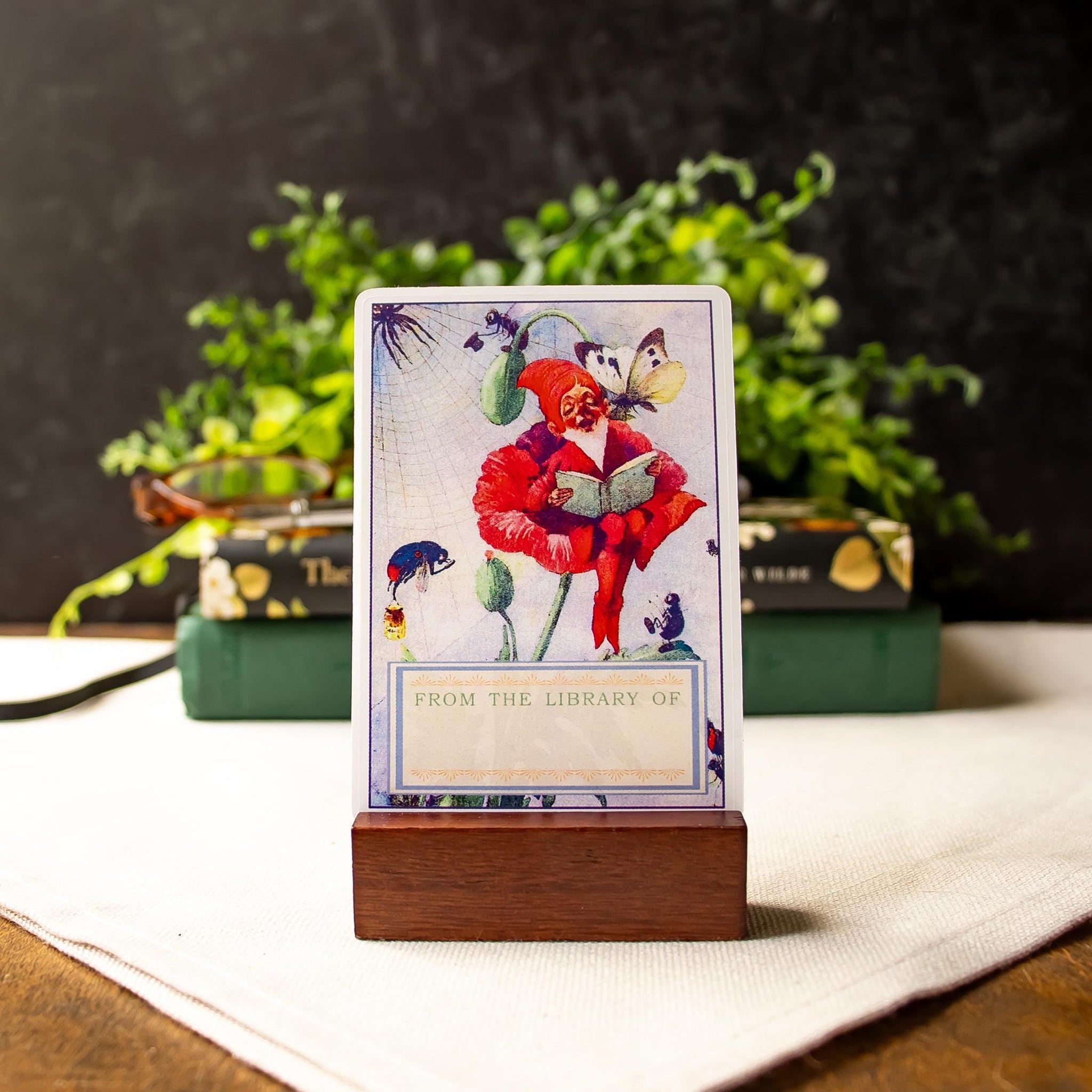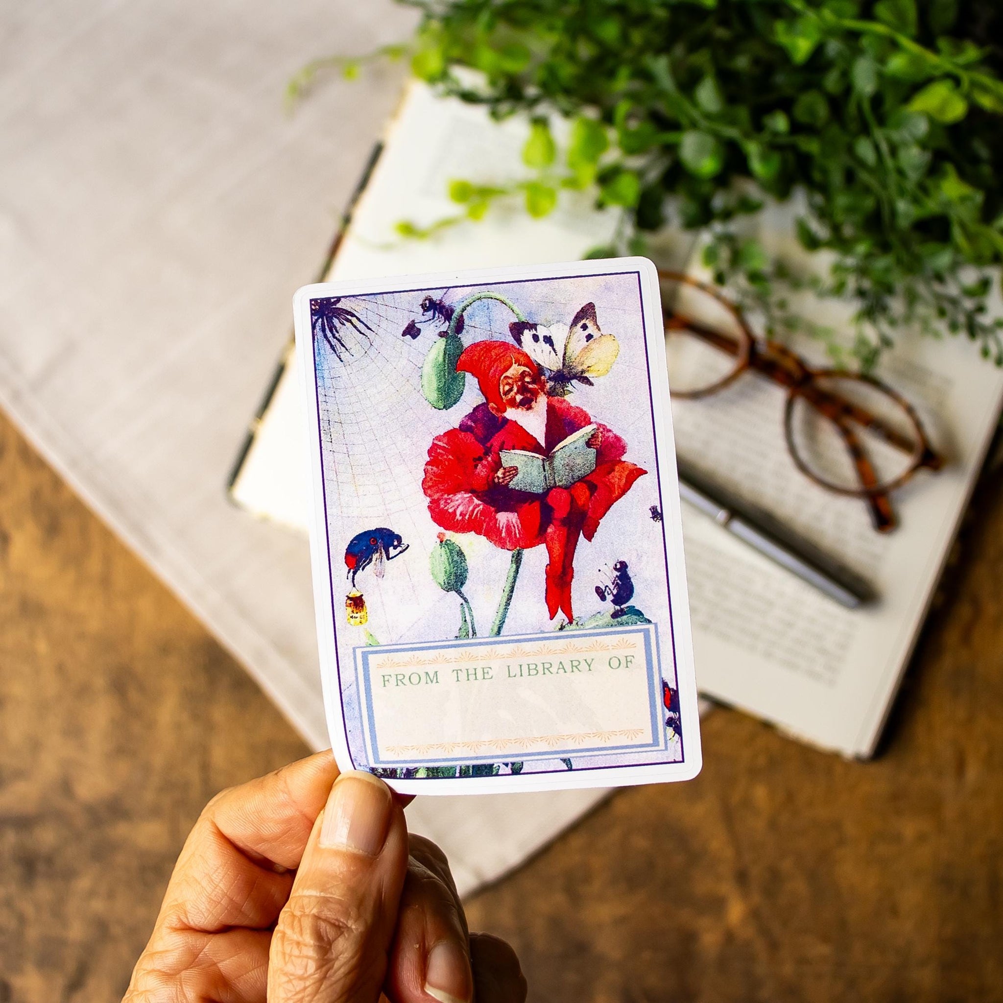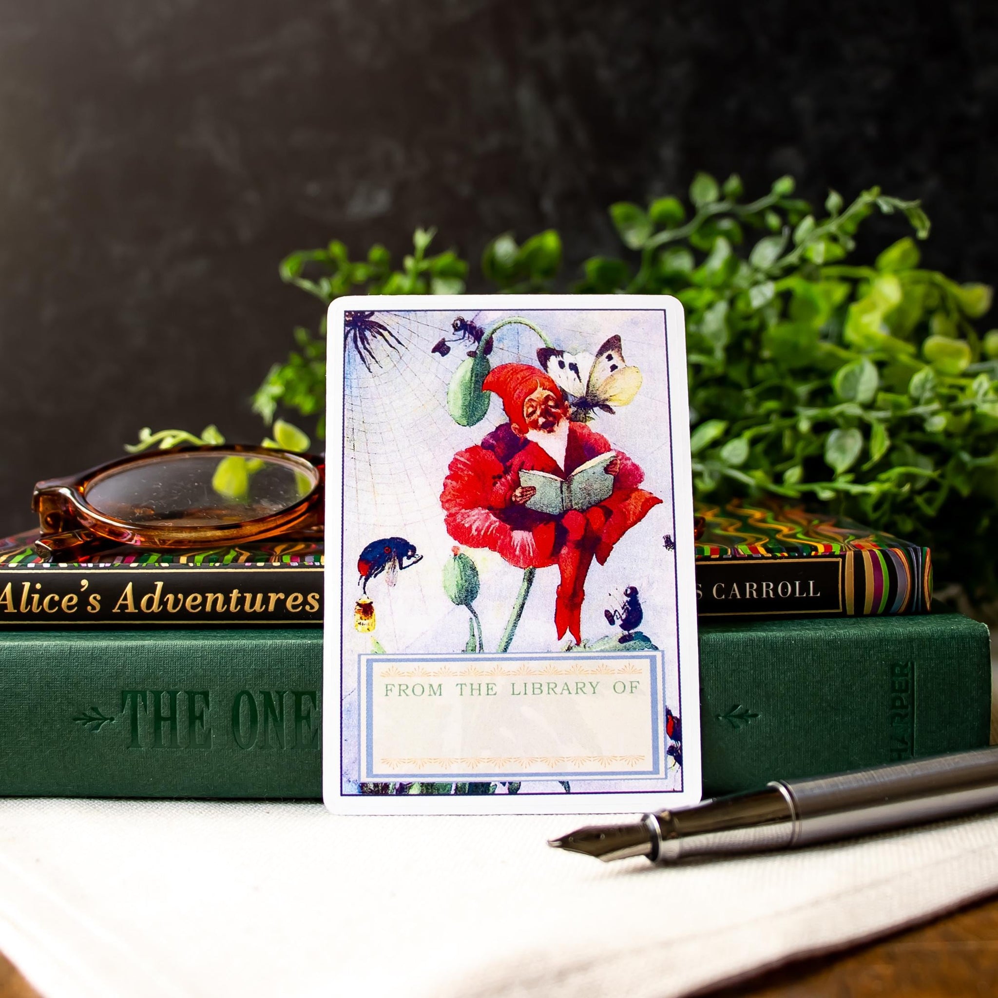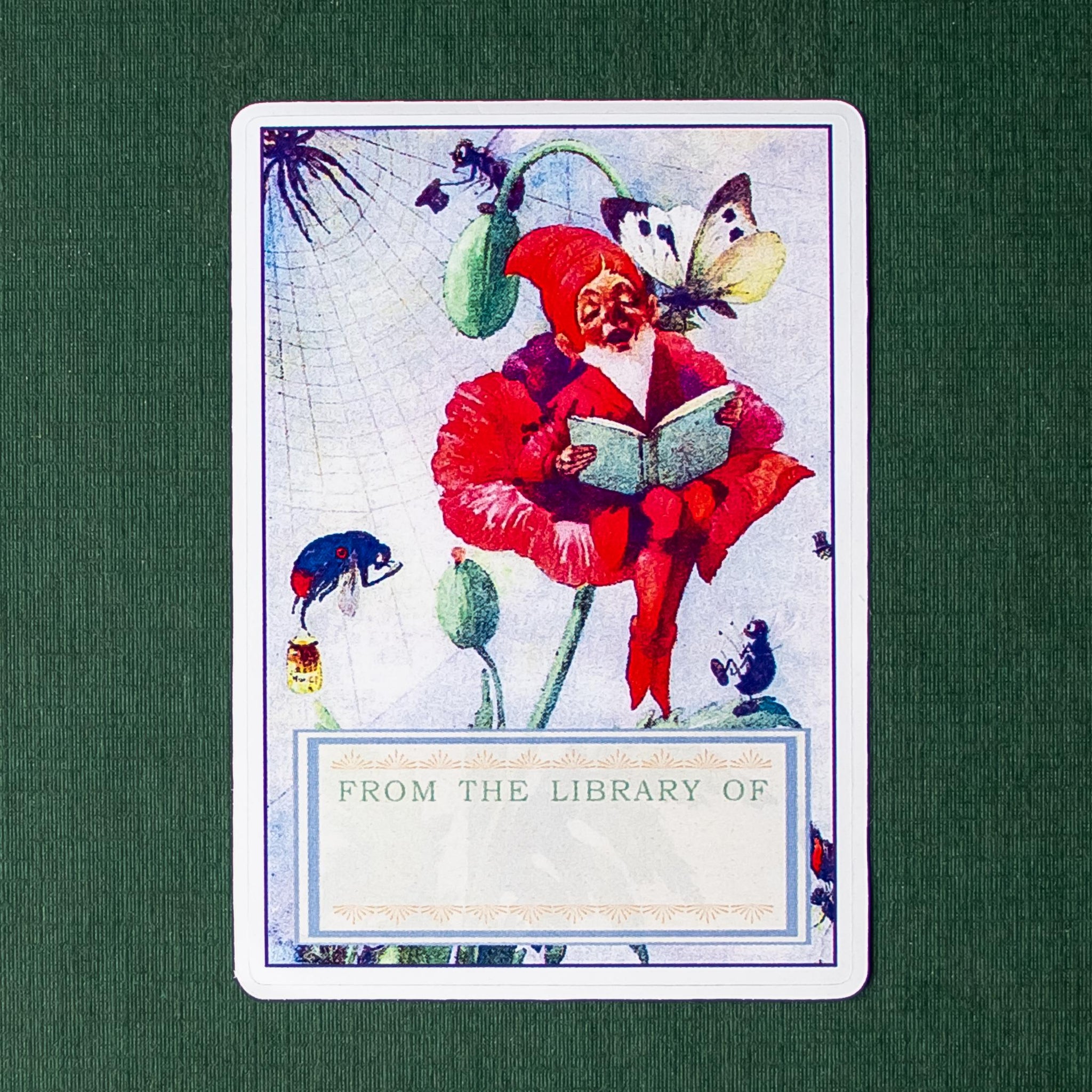 This set of charming peel-and-stick bookplates features a vintage-inspired illustration of a garden gnome seated in a flower, reading beneath fluttering butterflies, with a “From the Library Of” panel for your name or signature.