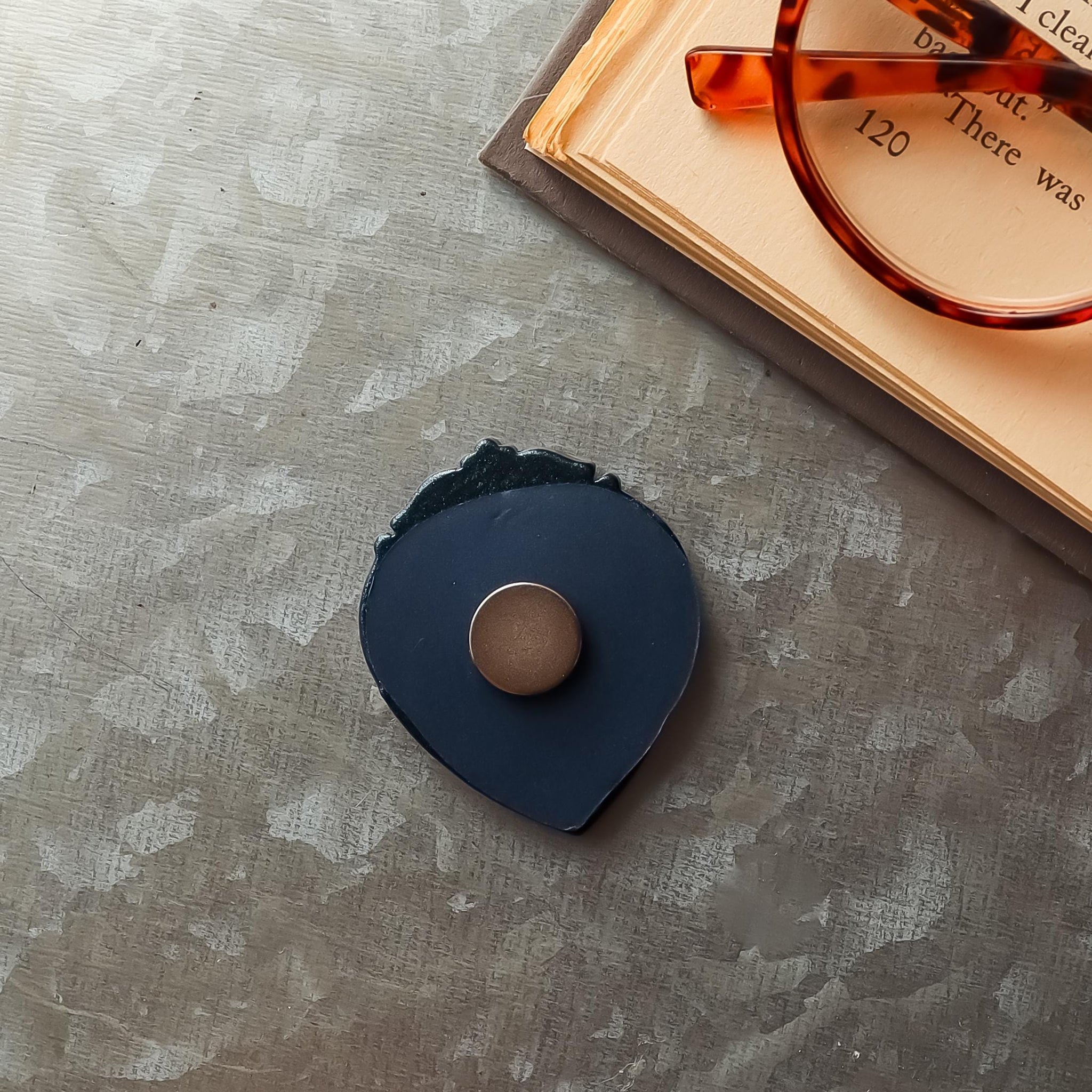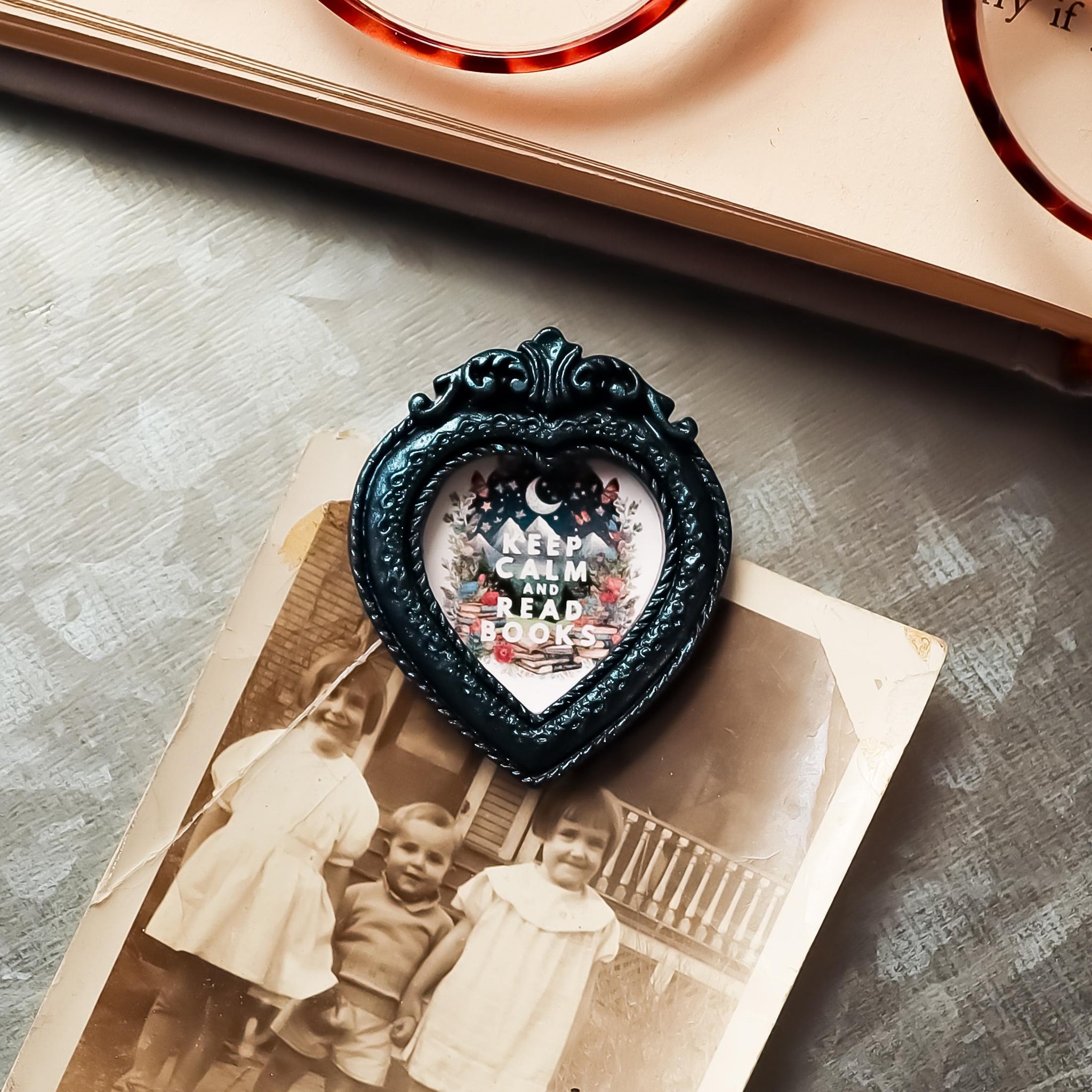 This handmade magnet features a vintage-style ornate navy blue heart-shaped frame encasing a dreamy floral scene with a moonlit night sky.