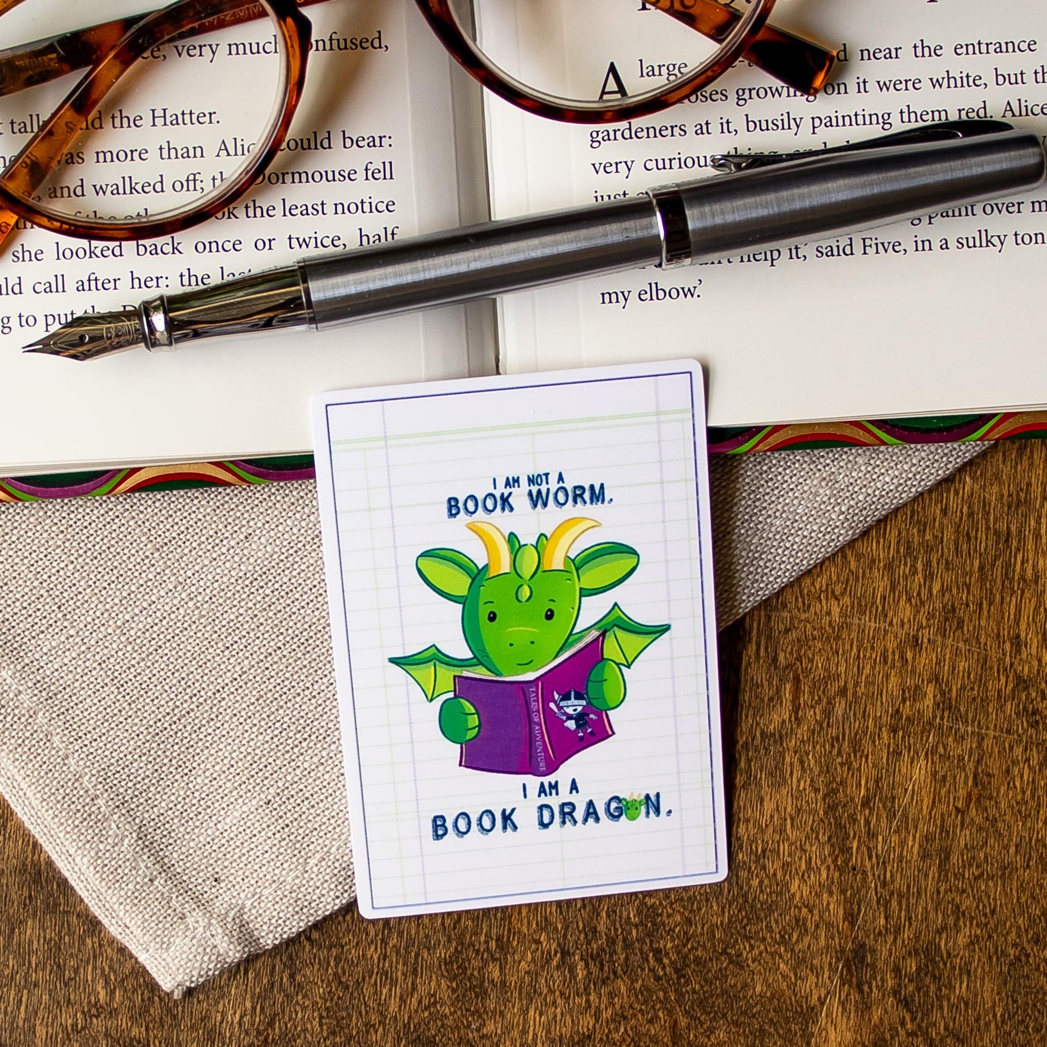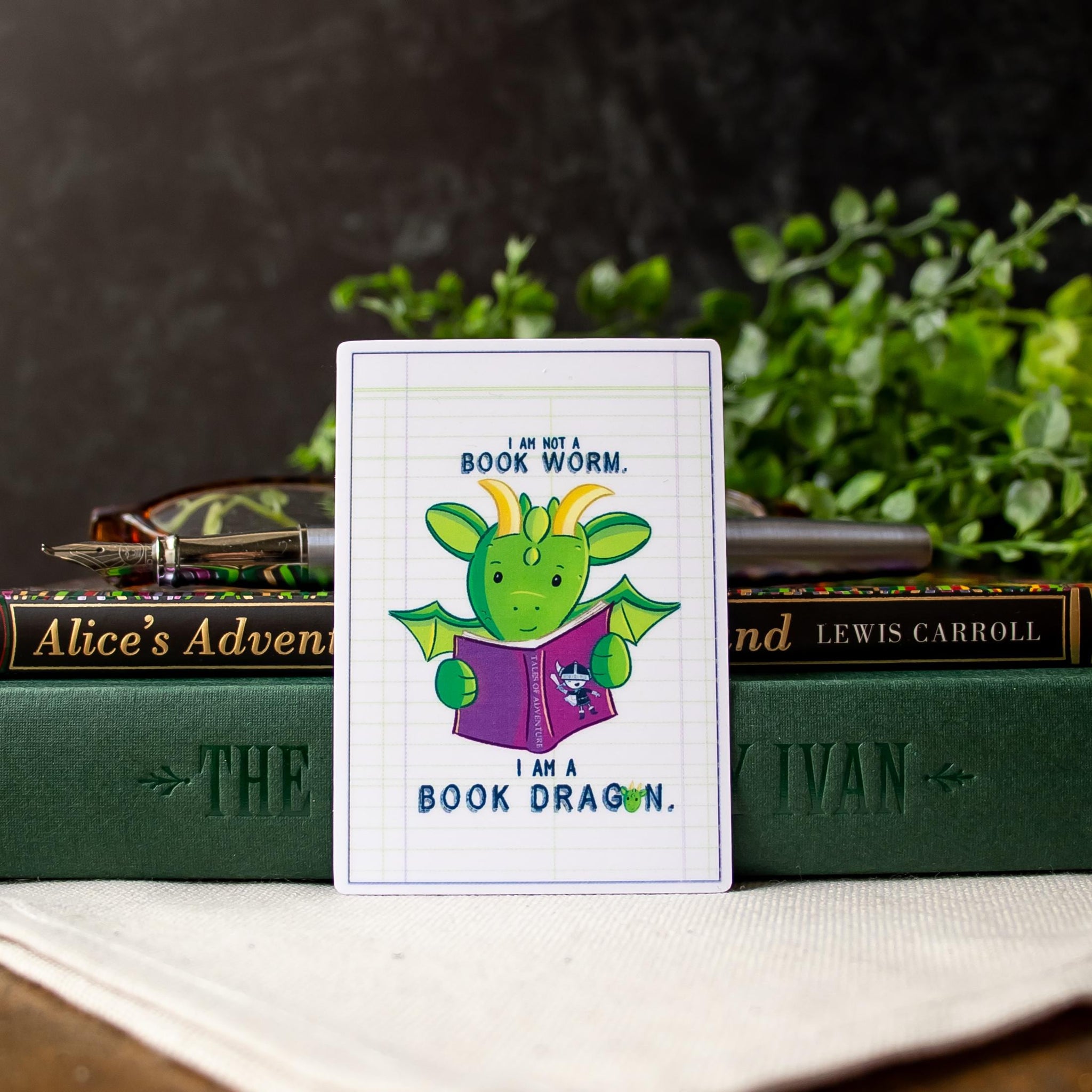 This handmade matte-finish laminated vinyl sticker features a whimsical green dragon reading a book, perfect for decorating water bottles, laptops, journals, and more.
