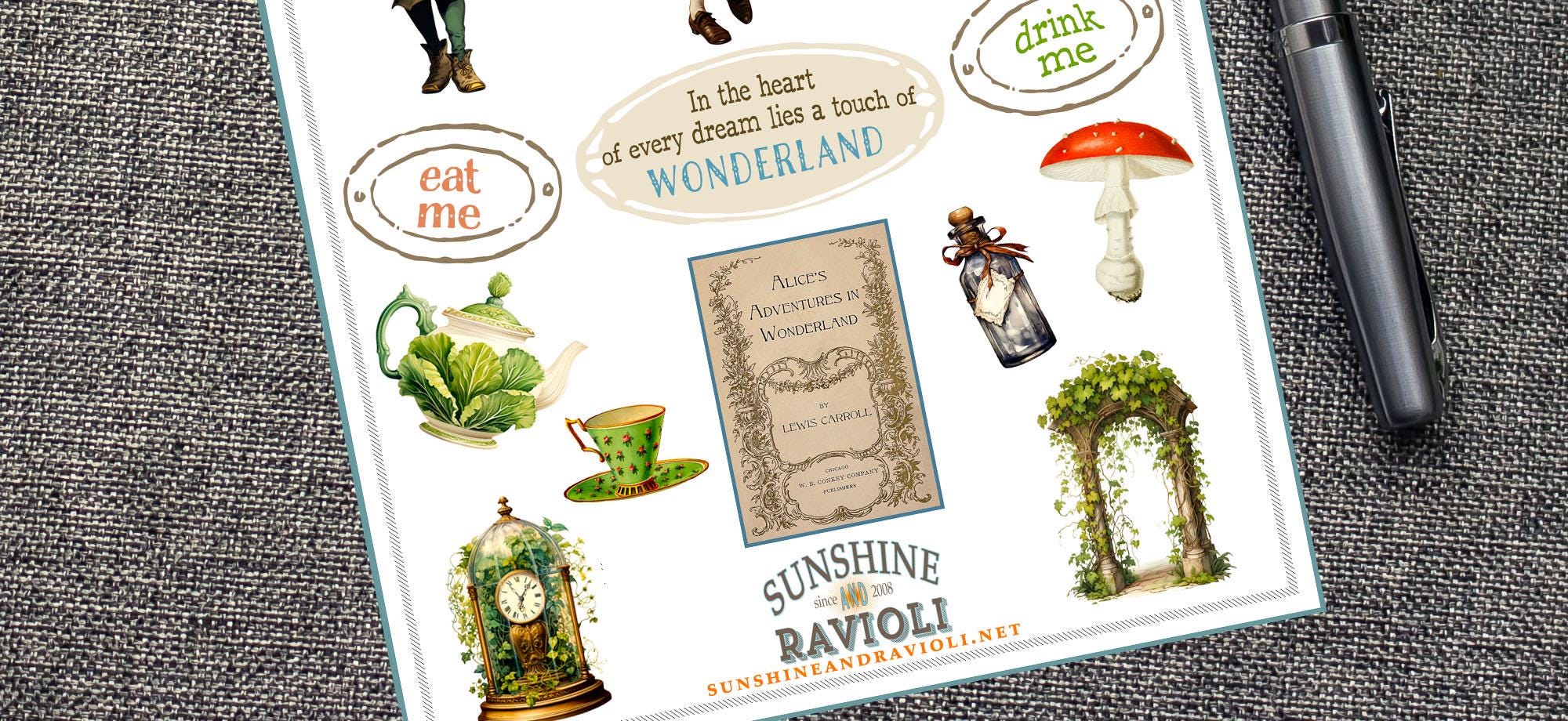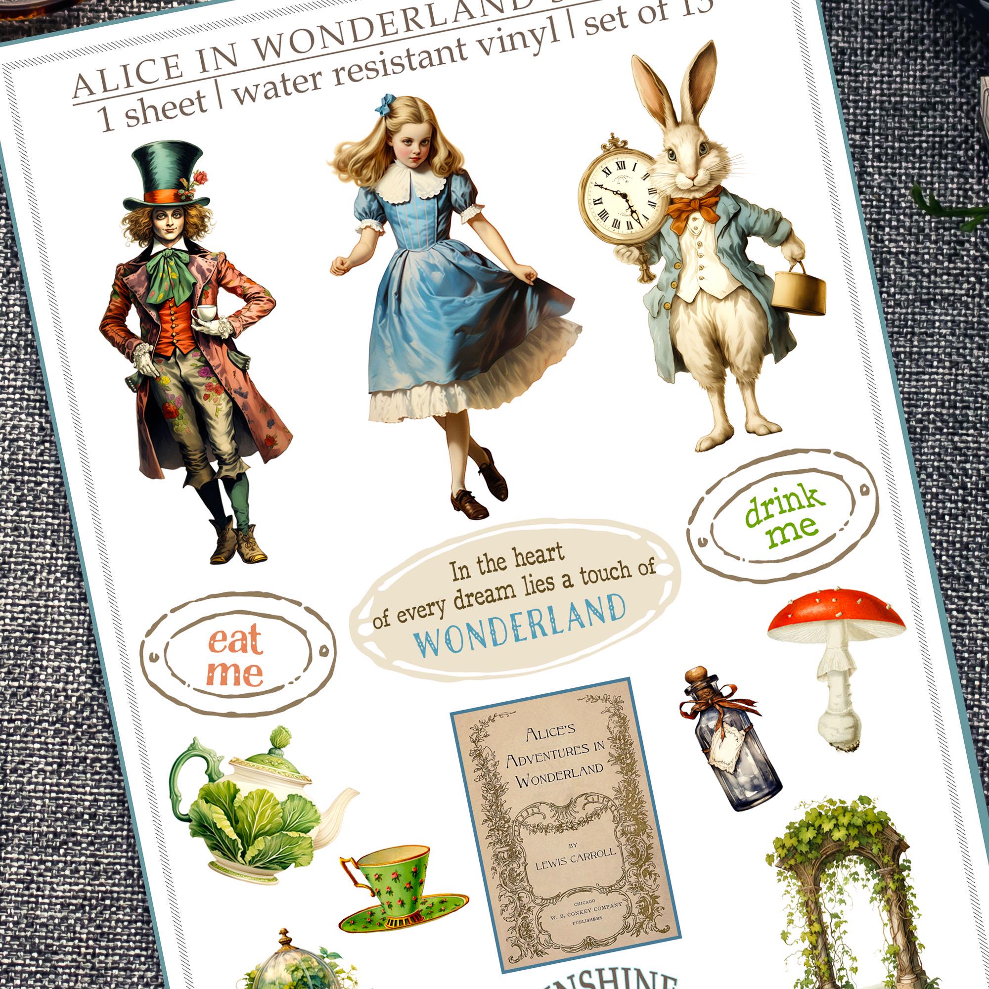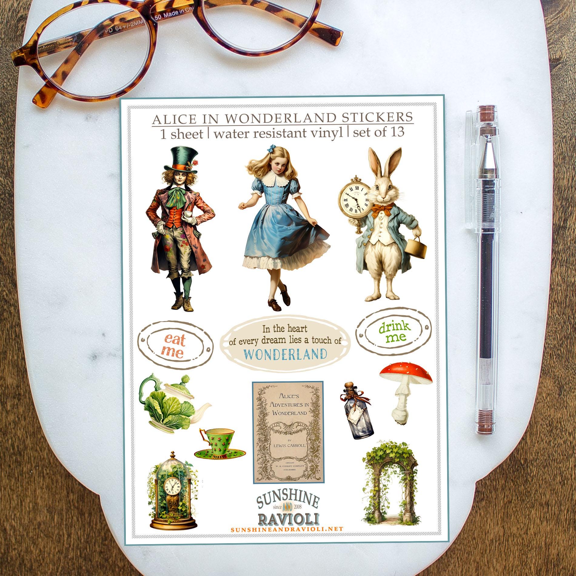 This Alice in Wonderland sticker sheet includes 13 beautifully detailed vinyl stickers inspired by the original storybook—featuring Alice, the White Rabbit, the Mad Hatter, tea party icons, vintage illustrations, and beloved quotes.