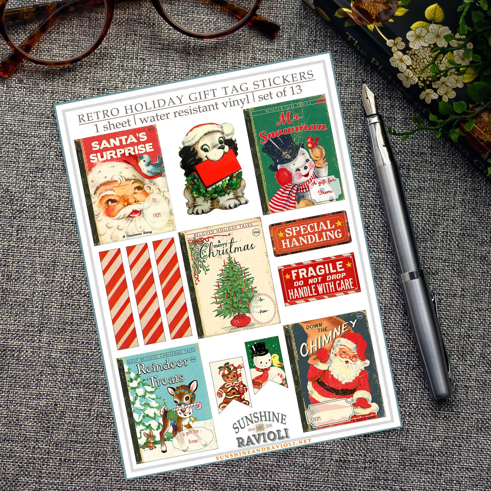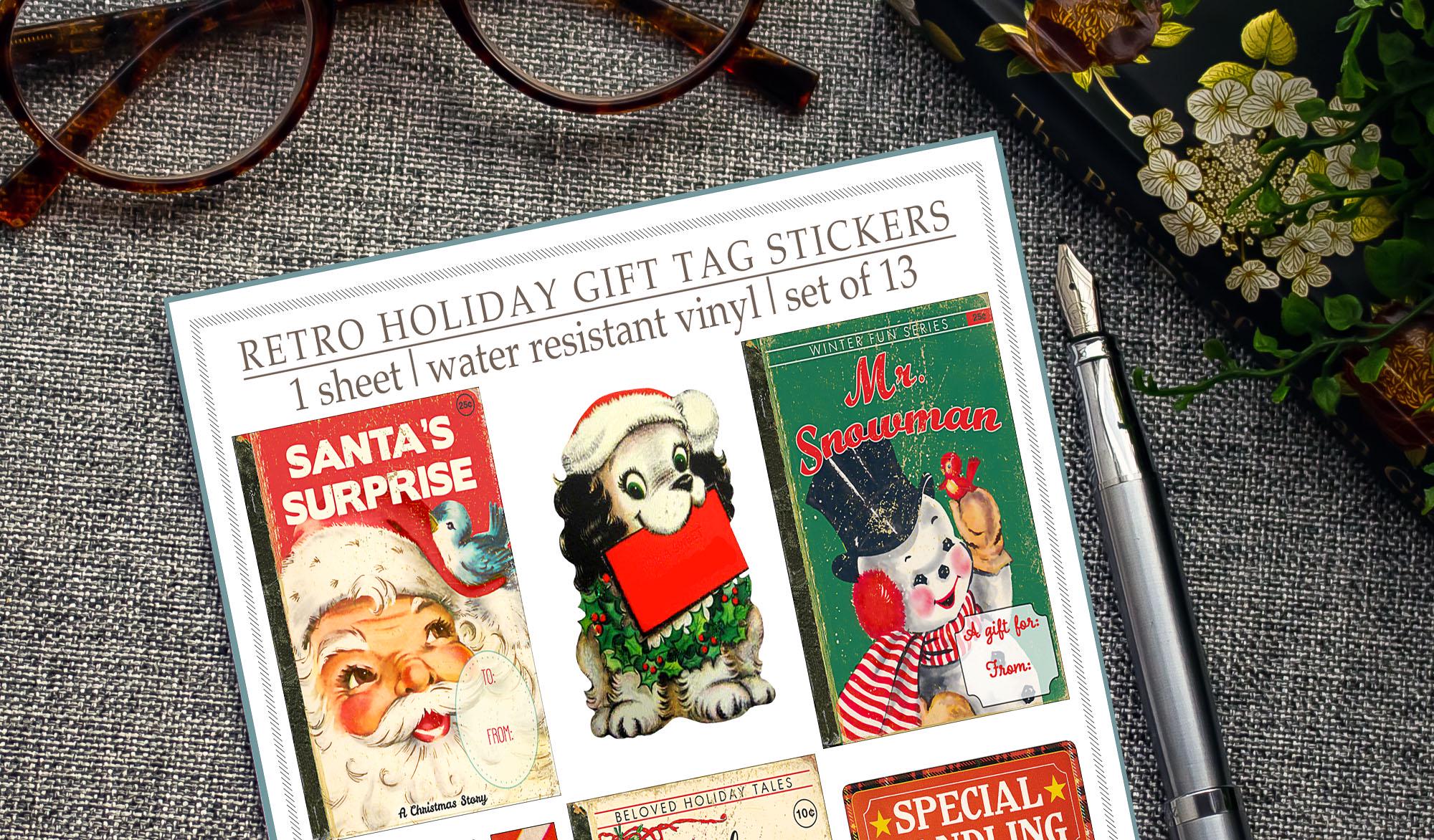 This cheerful holiday sticker sheet features 13 vintage-inspired gift tag designs ā from classic Santas and reindeer to candy stripes, snowmen, and āfragileā labels. Printed on matte water-resistant vinyl, theyāre perfect for giving packages that charming midcentury touch.